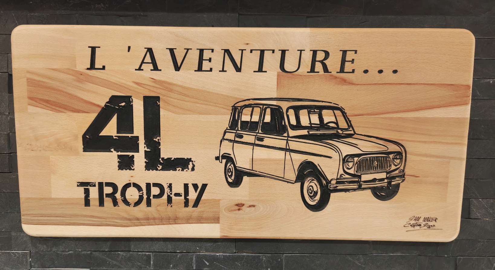Gravure profonde : Le dessin de la 4L, les logos et l'inscription sont fraisés à 3 mm de profondeur, offrant un rendu texturé et authentique.