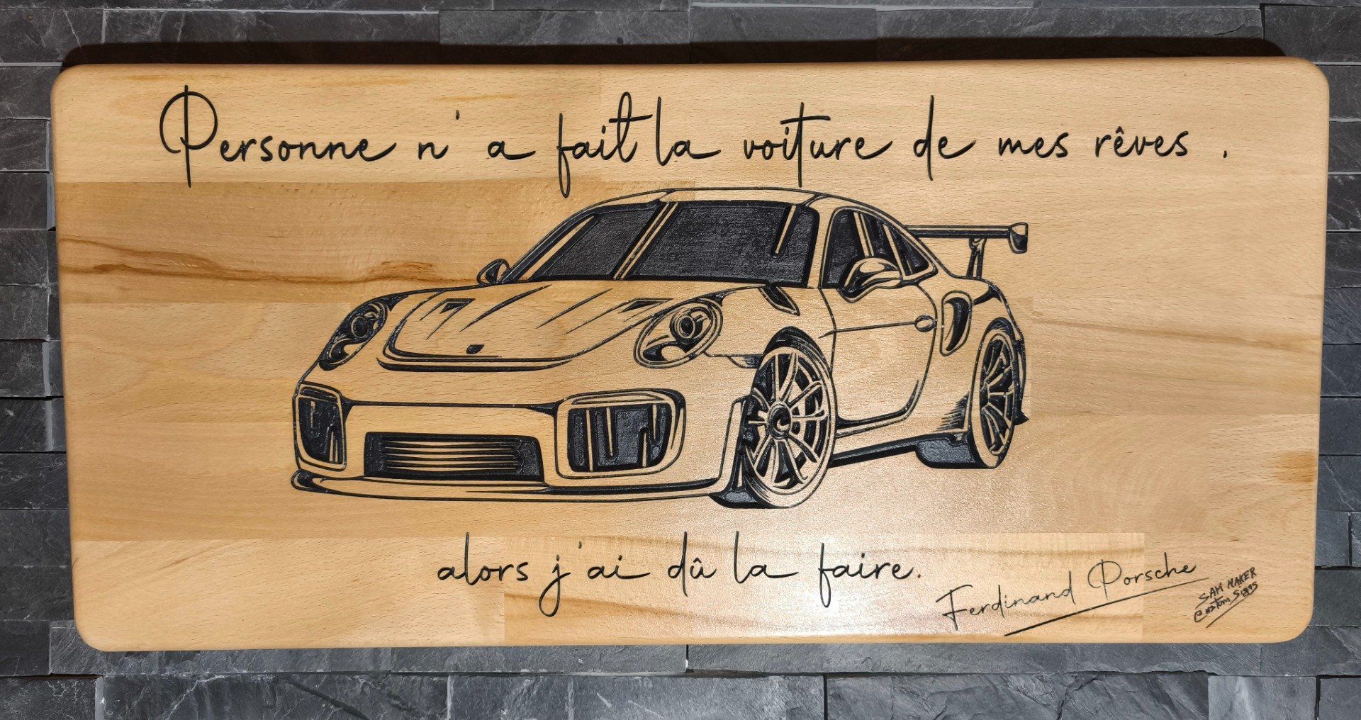 Gravure en profondeur : Le dessin détaillé de la Porsche et la célèbre citation sont fraisés à 3 mm de profondeur, créant un relief élégant et qualitatif.