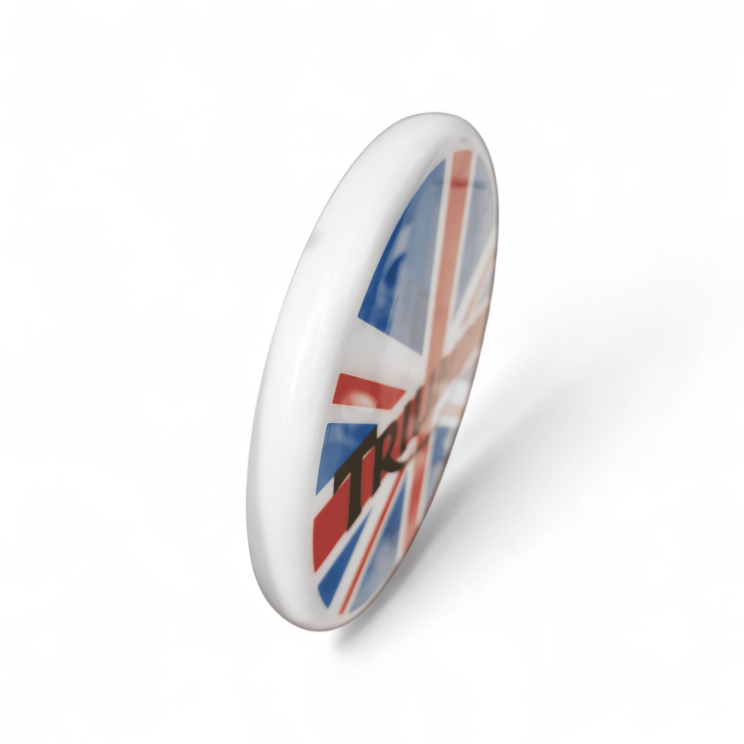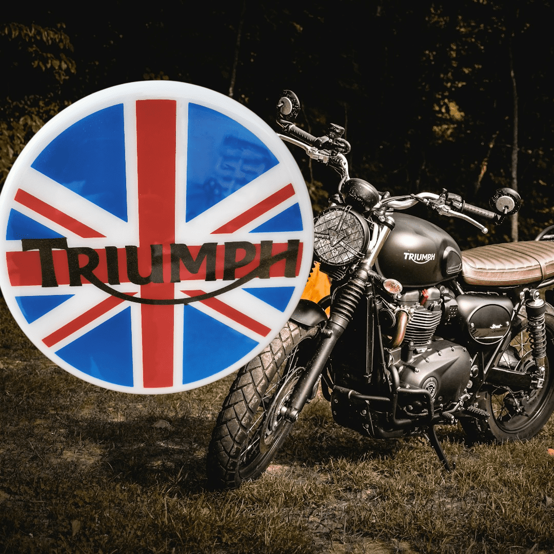 Design Iconique : Le célèbre logo Triumph sur fond de drapeau Union Jack, symbole ultime de l'ingénierie et du style anglais.