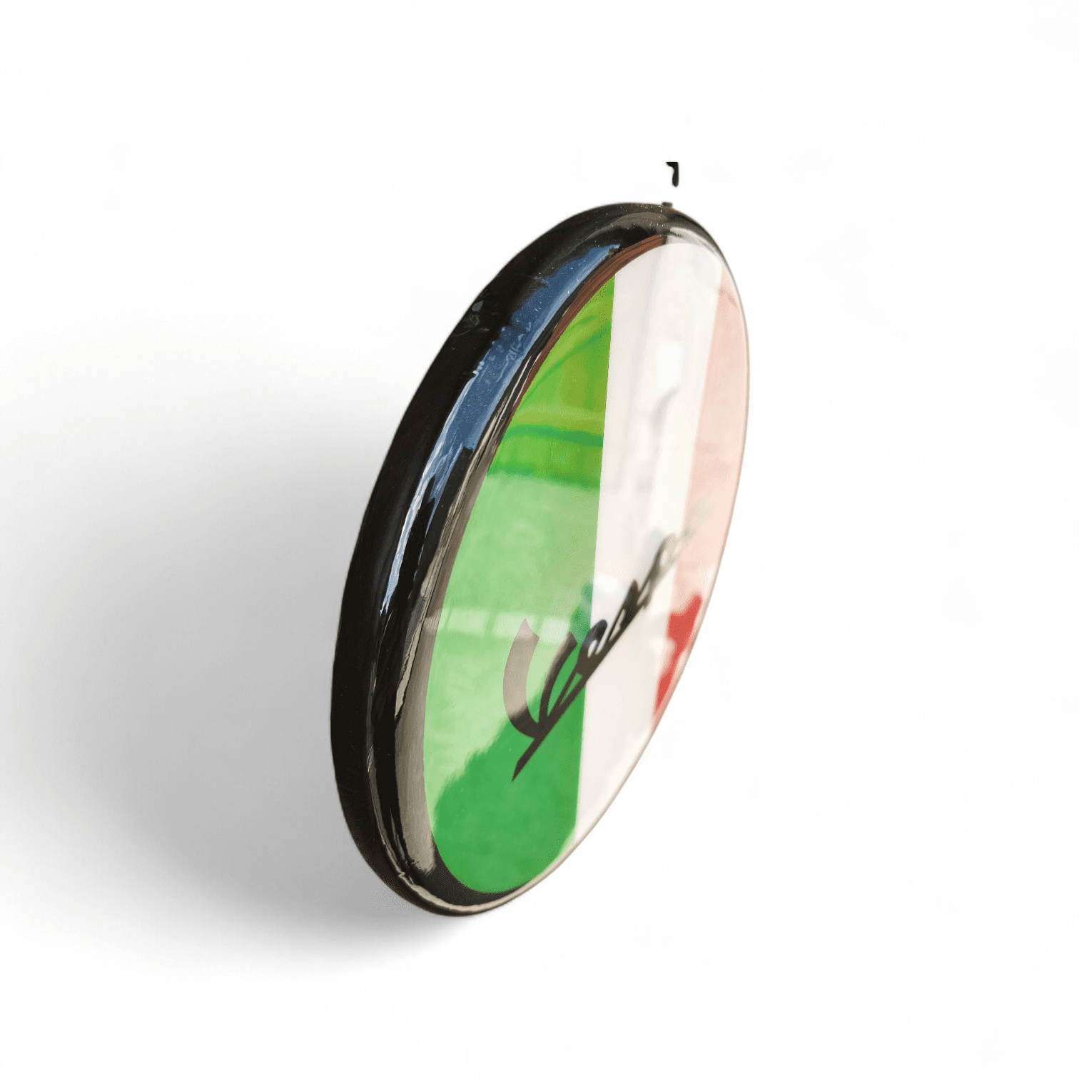 Design : Le logo Vespa noir en calligraphie classique, superposé de manière iconique sur les bandes verticales vert, blanc, rouge du drapeau italien.